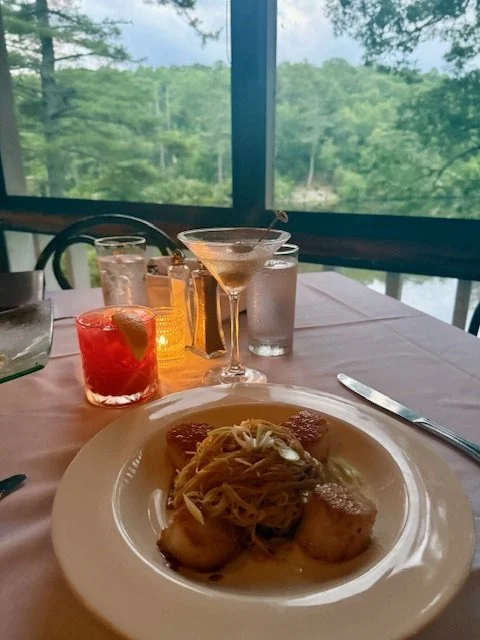 We had the most romantic, candlelit dinner overlooking a small lake and the surrounding forest. The setting was so peaceful and intimate—like being transported to a secret garden. The food was, without question, our favorite meal of the trip. The Seared Sea Scallops over angel hair pasta in a ginger scallion sauce were absolutely perfect, and the Maine Lobster Piccata tail was rich, bright, and melt-in-your-mouth tender. The service was warm and attentive without being overbearing—truly one of those meals where everything just clicks.